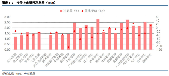 具体来看,2020年净息差正增长的有3家银行,分别是天津银行、哈尔滨银行和渤海银行,净息差分别同比提高5bps、25bps、14bps至2.26%、2.20%、2.35%。而净息差最高的分别为泸州银行和九台农商行,分别为2.78%、2.75%,同比下降30bps、0bp。净息差最低的为汇丰控股1.19%,同比下降17bps。净息差降幅最大的为锦州银行,同比下降106bps至1.42%。