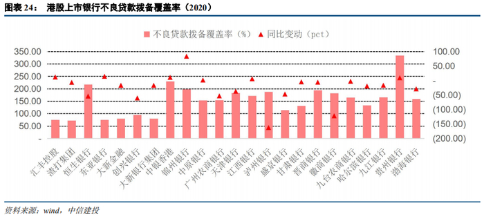 具体来看,2020年不良贷款拨备覆盖率最高的为贵州银行,同比提高9.41个百分点至334.36%,同时不良率为港股上市的内地银行中最低,在港股内银中资产质量最好。其次拨备覆盖率超过200%的为两家香港银行,分别为恒生银行及中银香港。国内银行中拨备覆盖率降幅超过100个百分点的有两家银行,分别是泸州银行及徽商银行。国内银行中拨备覆盖率最低的为盛京银行,仅114.05%,同比下降46.85个百分点。