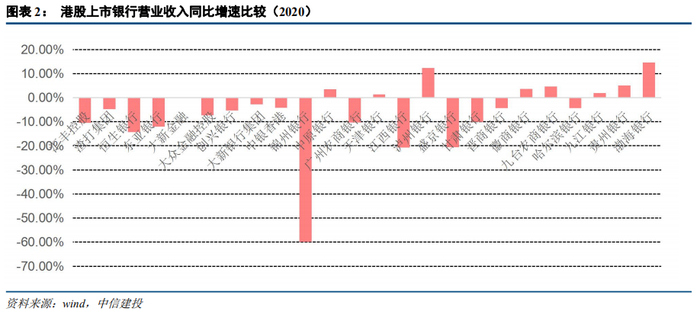 香港银行的营收降幅较1H20有所缩窄。其中大新金融营收增速降幅最小,全年同比下降仅0.04%;而恒生银行降幅最大,为14.24%,但降幅已较1H20收窄4.85个百分点。部分银行营收增速降幅进一步扩大,包括创兴银行及大新银行集团,2020年营收分别下降5.31%、2.70%。