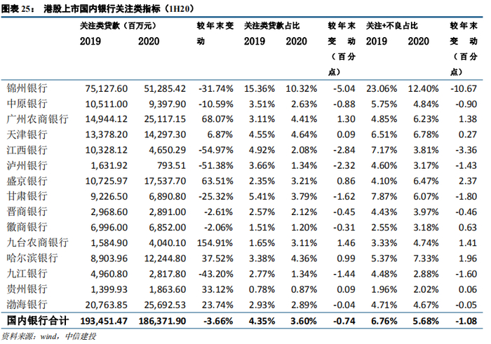 具体来看,关注类贷款改善最明显的是锦州银行,关注类贷款余额大幅下降了31.74%,关注类贷款、关注+不良占比分别下降了5.04、10.67个百分点,资产质量改善明显,但是关注类占比依然是同类银行最高的,达10.31%。其次关注类贷款改善较达的为江西银行,关注类占比为2.08%,同比下降2.84个百分点,关注+不良占比为3.81%,同比下降3.36个百分点。关注类贷款占比最低的为贵州银行,占比仅0.87%,同比微升9bps,关注+不良占比为2.02%,同比提升6bps。
