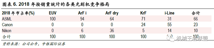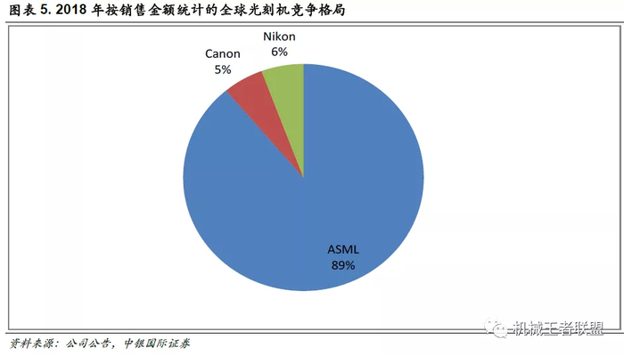 2018年全球光刻机市场上ASML市占率89%,2019年将继续上升2018年按销售金额计算ASML的市占率89%,Canon市占率5%,Nikon为6%。