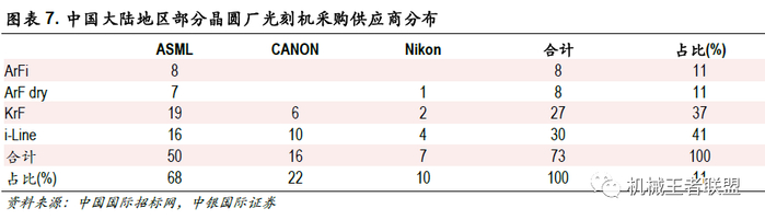大陆光刻机市场也被ASML垄断,上微承担光刻机国产化重任根据中国国际招标网,从部分产线的订购数量上统计,大陆光刻机市场上ASML市场份额68%, Canon市占率22%,Nikon为10%,与全球竞争格局基本一致,其中ArFi和ArF dry光刻机主要采购ASML,而KrF的70%订单和i-Line的53%订单都被ASML占据。