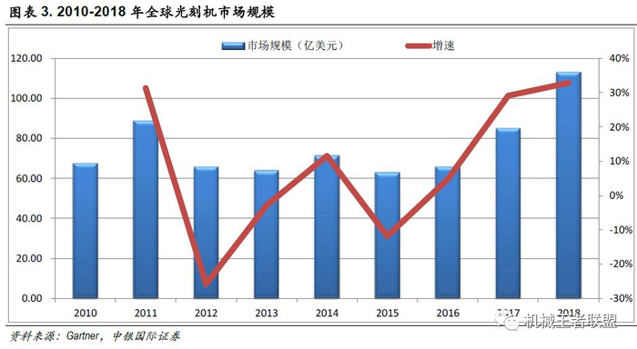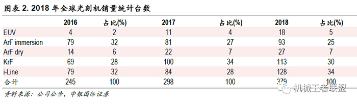 根据ASML、Canon、Nikon年报数据统计,2018年全球光刻机销量379台,其中EUV18台,ArFi93台,ArF dry27台,KrF113台,i-Line 128台,折合销售总额为113亿美元,占晶圆制造工艺设备市场的20%左右。