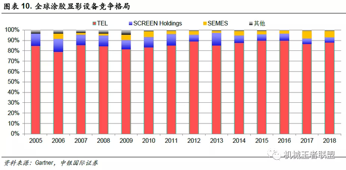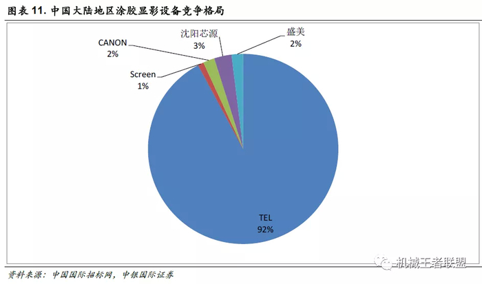 根据中国国际招标网统计,TEL在中国大陆的市占率92%,处于绝对垄断地位;涂胶显影设备国产化率仅为5%,沈阳芯源承担涂胶显影国产化重任。
