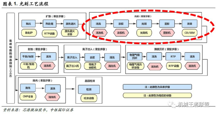 光刻工艺环节的光刻机和涂胶显影设备分别被ASML(ASML.US)、TEL垄断,去胶设备由屹唐实现80%的国产化
