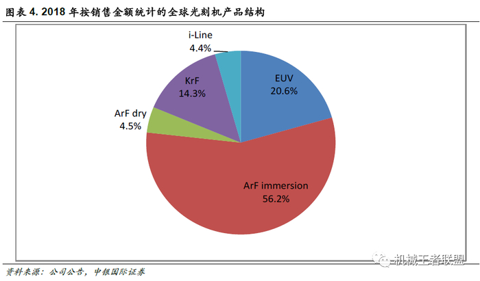 参考ASML光刻机单价推算,2018年光刻机市场上按销售额计算的EUV占21%,ArF i占56%,ArF dry占4.5%,KrF占14.3%,i-Line 占4.4%。