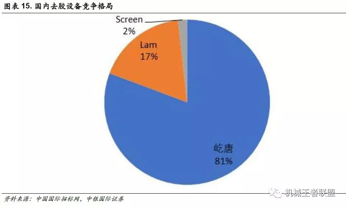 根据中国国际招标网数据统计的去胶设备竞争格局,屹唐半导体公司占81%,而进口品牌Lam Research、DNS依次占18%、2%。屹唐半导体在部分晶圆产线上的去胶设备市占率为100%;在个别晶圆产线上的市占率为2/3,Lam Research占1/3。