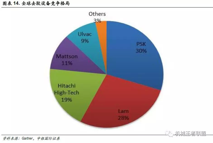 全球去胶设备主要供应商包括PSK、Lam Research、日立高科技、屹唐半导体、爱发科等,前三大供应商市占率合计76.5%。