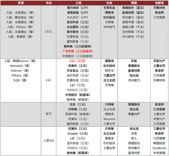注:以上为不完全统计,加粗为核心供应商,标红为电池企业自产。