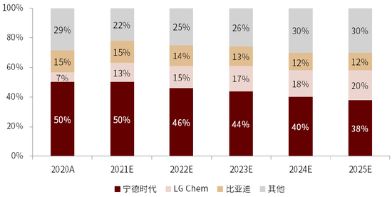 图表:我们上调CATL/LG Chem 2025e全球市场份额至30-35%