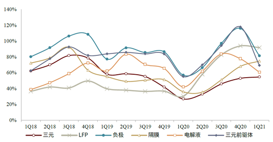 图表:1Q18至1Q21锂电材料开工率走势