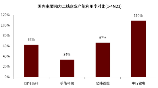 图表:配套份额提升使中航锂电1-4M21产能利用率显著高于其余二线锂电企业