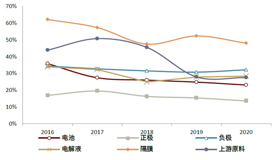 图表:16-20年锂电产业各环节毛利率走势