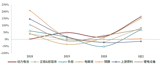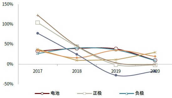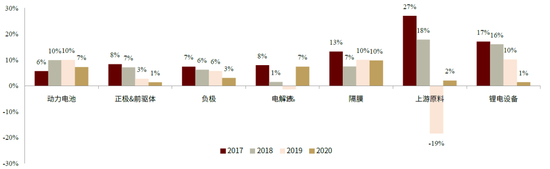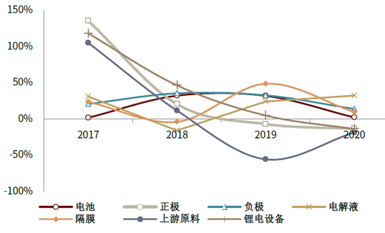 图表:17-20年锂电产业各环节收入增速