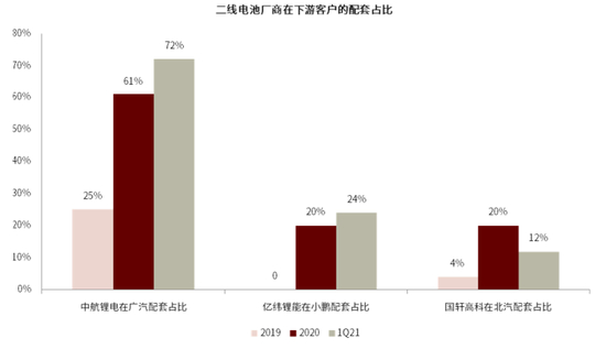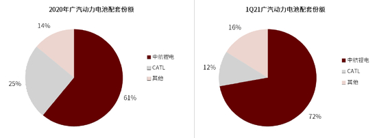 图表:受益需求溢出,中航锂电1Q21在广汽配套份额大幅提升,其余二线企业不显著