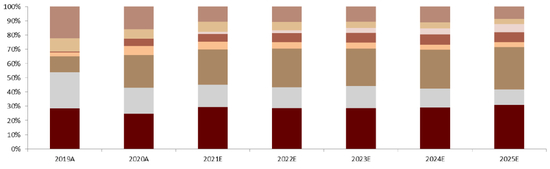 从供应全球化的角度,海外需求向龙头集中。我们认为2021-2023年是海外布局的关键窗口期,宁德、LG等龙头持续加码海外产能布局,并带动具备竞争优势的电解液、隔膜环节跟随;而二线电池企业出海节奏缓慢;龙头企业出海有望享受海外市场高增长红利,带来远期市场份额预期上行,我们上调LG Chem和CATL 2025e全球市场份额至30-35%,上调隔膜龙头恩捷股份2025e全球市占率45-50%,电解液龙头天赐材料2025e全球份额35-40%。
