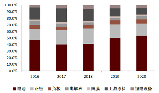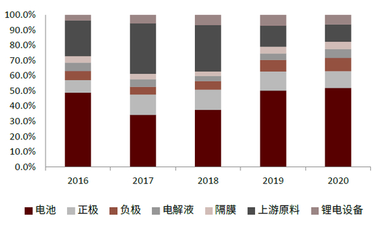 图表:16-20年锂电产业各环节收入占比走势