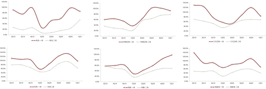 图表:动力和材料产业链一/二线企业产能利用率变化(2Q19-1Q21)