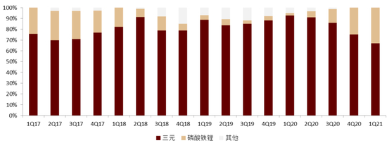 图表:铁锂自3Q20以来在新能源乘用车领域快速渗透,1Q21达到33%