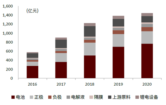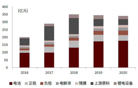 图表:16-20年锂电产业各环节收入走势