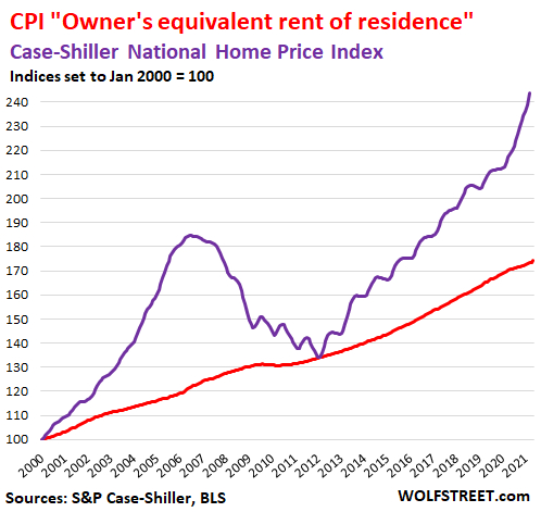 5月,Case-Shiller房价指数同比上涨13.2%,为2005年12月以来最强劲增长(紫色线)。这是一种更为现实的房价通胀衡量方法,衡量同一套房屋价格随时间的变化。