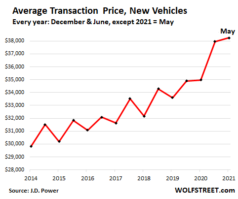 5月,耐用品价格同比暴涨10.3%,尤其二手车增幅达到30%,新车价格也同比上涨3.3%,为2012年来最大涨幅。据JD Power数据,5月份新车零售“平均交易价格”(ATP)跃升至38255美元,而ATP在过去七年已增长28%,去年6月来更是增速大幅提升。