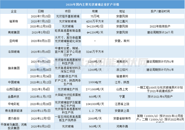 福莱特2020年宣布扩产75万吨光伏组件盖板玻璃、年产4200万平方光伏背板玻璃和5座日熔化量1200吨光伏组件玻璃项目;2021年3月29日再次宣布扩建6座日熔化量1200吨光伏玻璃。