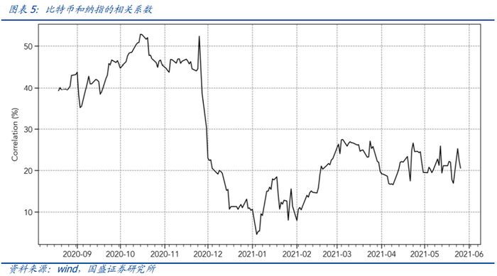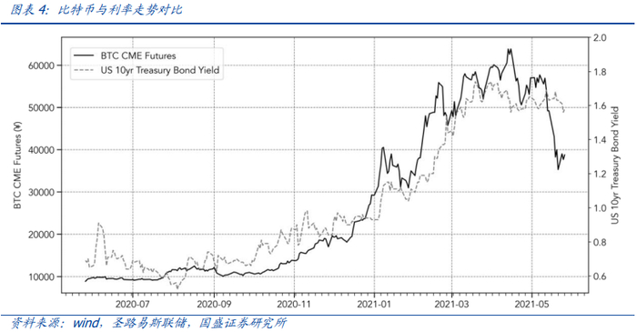 实际上,比特币目前与美元资产的相关性并不强。自2020 以来,由于全球新冠疫情的影响,美联储于去年调低了利率水平至历史低位,同时辅以货币增发来抗击新冠给经济所带来的影响。从下图中我们也可以看到,虚线所代表的美国十年期国债利率于2020年8月处于最低位,达到了 0.5% 左右。而随着新冠疫苗的大力推进和经济的复苏逐渐,利率水平也逐渐恢复至疫情前正常水平。通常我们能够发现,美国中长期国债利率与资本市场走势呈相反态势,即国债利率涨,股票市场收益率降低。造成这一现象的原因是因为如果美国债利率(即所谓的无风险收益)上涨,按照DCF模型,那么势必要影响资本市场的定价,导致权益市场整体收益率降低。在下图中,我们并不能发现上述反向的关系,甚至比特币走势在 2021年五月前与美国债利率呈现正相关的走势。这也说明了,比特币的价格波动实际并没有过多地受到宏观经济政策及大盘的影响。