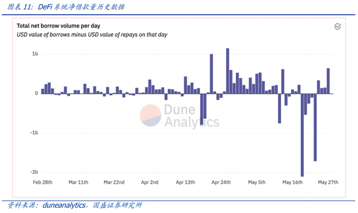从净借款量数据来看,极端行情下借款率较为稳定,借贷需求并没有明显收缩。观察DeFi系统近三个月的净借款量,除了5月19日到23日这几天的快速下跌出现了大幅缩减以外,基本维持在一个恒定范围内。期间的大幅缩减主要是由于价格剧烈波动引起的短期集中清算,但后续快速回到了三个月内的平均范围说明DeFi生态中的借贷行为并没有因为集中清算和价格波动而停止。在极端行情下,借款的需求并没有收到明显的收缩。