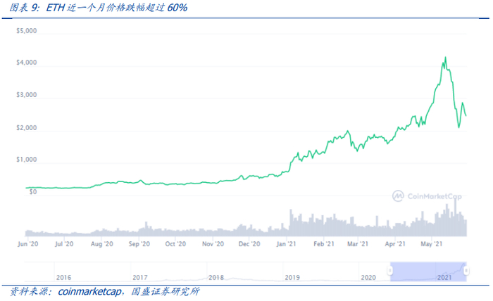 比特币、以太坊等主流加密货币在过去的一个多月内几乎全部腰斩。从去中心化市场的价值之锚——比特币的历史价格中我们可以看到,自去年三月,比特币的市场价格便一路上涨,从 2020 年3月的3600美元一直增长至 2021 年 4 月的最高点,超过64000美元。与之同时增长的还有整个 DeFi 生态,根据我们的以太坊指数,以太坊生态自 2020 年 6 月翻了近 8 倍,这一期间也被称之为 “DeFi 之春”。然而,当我们把时间线聚焦到最近一个月,比特币等几乎绝大部分加密货币价格出现了快速下跌的极端的行情,比特币从一个月内的最高点64899美元腰斩,最低跌至30000美元(coinbase价格),实际跌幅超过53%,其中5月10日至5月20日的跌幅即达50%。更进一步,从5月下旬以来,币价短期出现断崖式的下跌,幅度最大的一次在两小时内跌去了 5000 美元,接近 13% 的跌幅。而通常其他币种的跌幅都超过比特币。