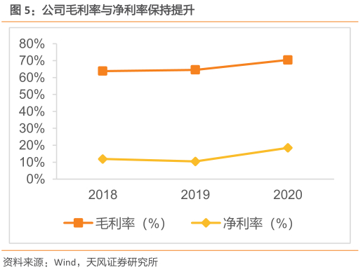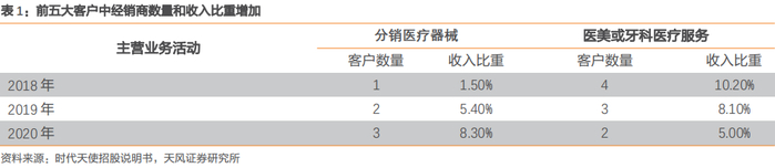 经销渠道扩大,加速拓展市场。2018年-2020年公司前五大客户中医疗器械经销商数量由一家增加至三家,相应收入比重增加至2020年的8.3%,前五大客户中提供医美服务和牙科医疗服务的直销客户从四家变为两家,销售收入占比从2018年的10.2%降低至2020年的5%。