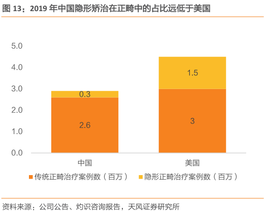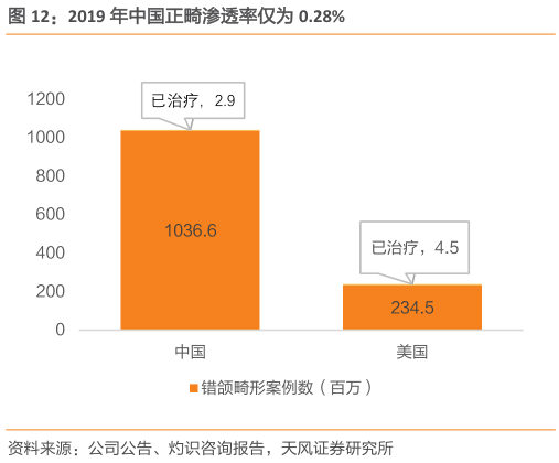 国内正畸市场、尤其是隐形正畸市场渗透率较低。2019年,美国2.44亿错颌畸形患者中已有450万人得到治疗,同年,中国10.37亿错颌畸形患者中仅有290万人得到治疗,渗透率仅为0.28%。中国错颌畸形患者多选择传统正畸方式矫治,2019年美国经治疗的450万例错颌畸形病例中有约33.1%采用隐形矫治方式治疗,而中国290万治疗的错颌畸形案例中仅有10.5%采用隐形矫治器。
