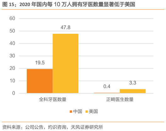 国内口腔正畸医生供给相对不足。根据灼识咨询报告,2020年美国约有15.84万名全科牙医及1.08万名正畸医生,相当于每10万人有47.8名全科医生及3.3名正畸医生。相比之下,2020年国内约有27.75万名全科牙医及6100名正畸医生,相当于每10万人仅19.5名全科牙医及0.4名正畸医生。随着民营口腔医疗机构的持续增加,口腔医生的培训力度逐步加大,将有助于打开医生供给的瓶颈。