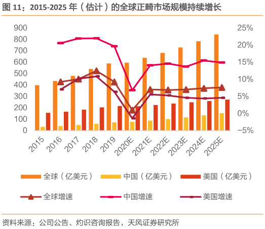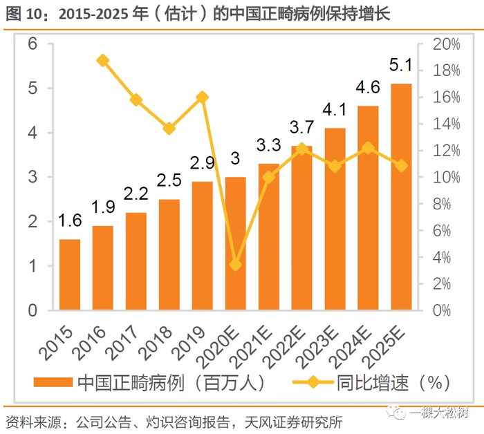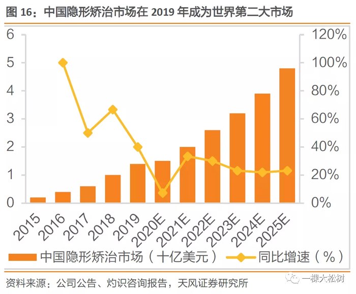 中国正畸市场扩张引领全球正畸市场增长。2015年至2019年,全球正畸市场的零售销售收入从399亿美元增加至590亿美元,复合年增长率为10.3%。受收入水平增加、消费者牙齿健康意识提高以及正畸治疗机构增多等因素的影响,中国正畸市场规模从2015年的34亿美元提高至2019年的73亿美元,复合年增长率为20.7%。根据灼识咨询报告,预计2019年到2025年中国正畸市场销售收入复合年增长率有望达到13.25%,2025年销售收入有望达到154亿美元。而全球甚至美国的正畸市场规模增速均低于中国,2019年美国正畸市场规模为217亿美元,但同比增速仅为6.4%,远低于中国19.7%的市场增速,同期全球正畸市场增速约为9.3%,中国将持续引领全球正畸市场扩张。