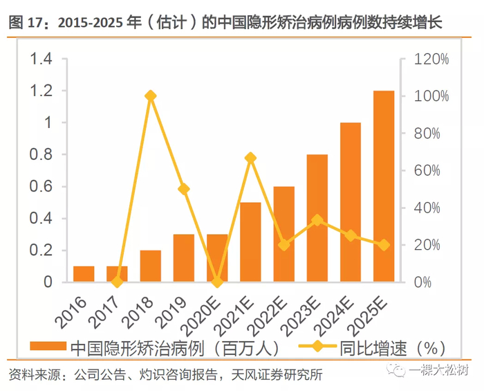 中国隐形正畸市场增速显著高于传统正畸。中国隐形矫治市场在2019年成为世界第二大市场。就零售销售收入而言,市场规模由2015年的2亿美元增至2020年的15亿美元,复合年增长率为44.4%,并有望于2025年达到48亿美元,自2020年至2025年的复合年增长率预计为26.2%。此外,中国通过隐形矫治器解决的正畸案例数目由2015年的47,800例增至2020年的33.55万例,复合年增长率为47.7%,并预期将于2025年达到120万例,自2020年至2025年的复合年增长率预计为32%。