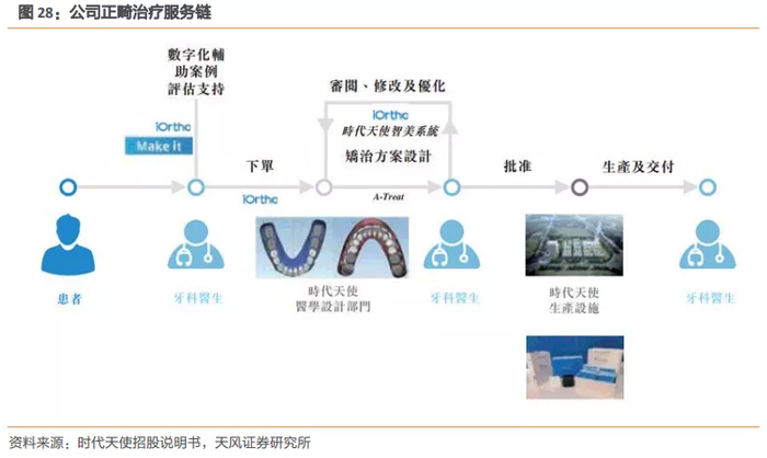 数字化赋能矫治服务链。公司服务分为以下几个步骤:(1)患者初诊时,提供数字化辅助案例评估,获取订单;(2)牙科医生编制、上传治疗数据;(3)制作三维数字模型、定制矫治方案并传送给医生;(4)牙科医生审阅、修改及批准矫治方案;(5)制作相应的隐形矫治器;(6)医生指导患者佩戴矫治器并在治疗过程中不断优化调整。