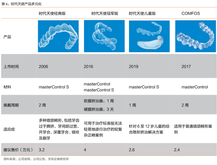 时代天使隐形矫治产品多元化,满足更多隐形正畸需求。公司已战略性地开发了全面的产品组合作为数字化正畸解决方案的组成部分,以满足不同的用户需求。目前已有四种具有多种特性、能够吸引不同用户群的隐形矫治器上市,包括时代天使标准版、时代天使冠军版、时代天使儿童版以及COMFOS。通过多元化的产品组合与医学及技术服务相协同,使得牙科医生能够有效处理越来越多具有不同复杂程度的错颌畸形案例。