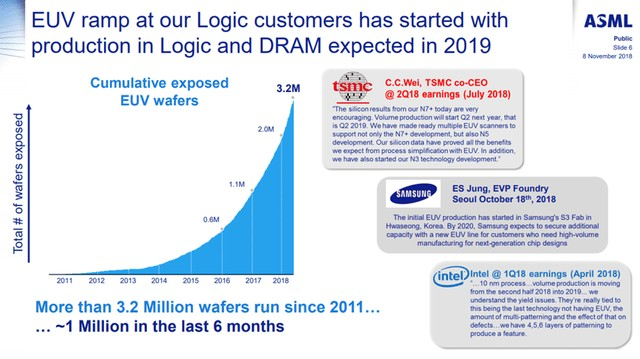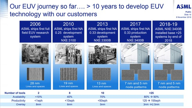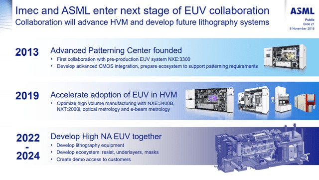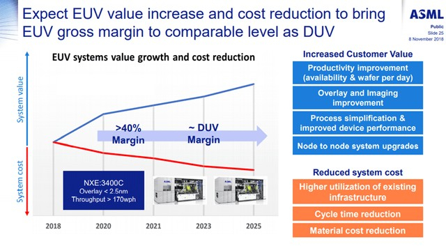 很简单,如果你做不到 5nm,就没有 3nm,正如我在上一篇文章中所讨论的那样。ASML 也是如此,因为如果他们进入 EUV 领域,竞争对手将落后于 ASML 数年,因为他们将与十多年前在 EUV 早期困扰 ASML 的相同问题作斗争。我已经收录了他们最近于 2018 年 11 月举行的投资者日的一些插图,下一次将于 2021 年 9 月举行。