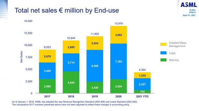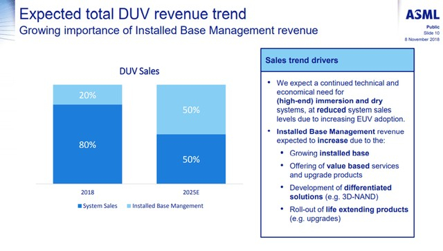 ASML 显示其通过“安装基础管理”扩大其机械生态系统的计划取得了进展,将总潜在市场增加了两位数以上的百分比,因为 2018 年的销售额为安装基础管理的 20%,而 2025 年的估计为 50%。