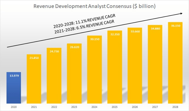 ASML 被分析师提供了到 2028 年的所有预测,但一旦我们超过 2025 年,即超过一位分析师覆盖的最后一年,覆盖范围就会减少。目前的估计显示,从 2020 年到 2028 年,收入复合年增长率为 11.1%,但如果我们去掉表现出强劲增长的 2021 年,复合年增长率为 6.5%。