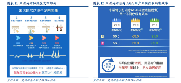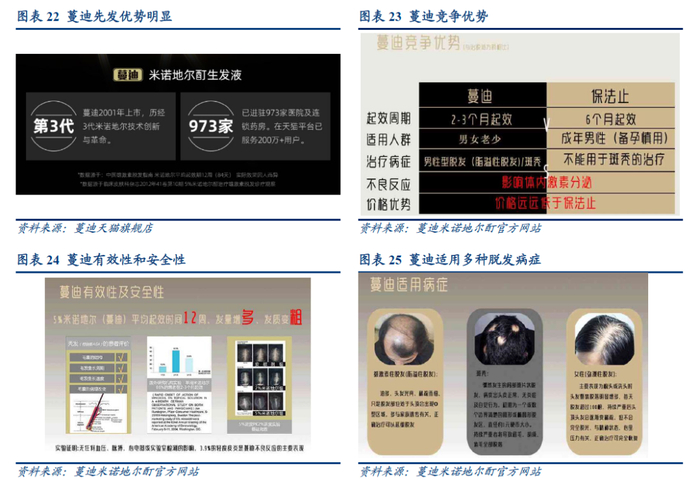 1) 蔓迪先发优势明显,蔓迪2001年获NMPA(当时为CFDA)认证上市,属于OTC类治脱发外用药,是国内同类药品中国内首家上市品种,调研数据显示其市占率大约为7成,在医生和消费者中积累了一定的品牌心智,成为全国范围内各大知名医院的脱发主治产品,且部分医院在外用药品上仅选择蔓迪。蔓迪官方宣称2-3个月即起效,5%蔓迪米诺地尔平均起效时间为12周,表现为发量增多、发质变粗;人群上男女老少皆宜,而部分品牌仅适用于成年男性,且不适用备孕人群;蔓迪适用于多种病症,包括雄脱、斑秃和女性弥漫性脱发。