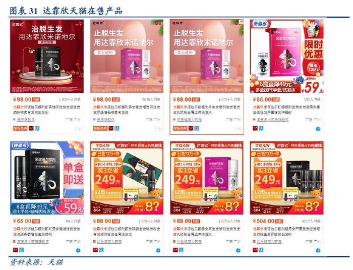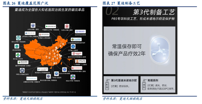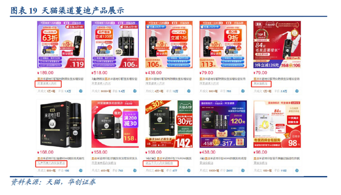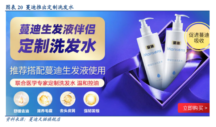2) 蔓迪广铺渠道,挂牌专诊数量领先。据蔓迪天猫旗舰店显示,蔓迪现在进驻973家医院及连锁药房,天猫平台已经服务200万+用户。广铺渠道不仅助力蔓迪形成较强品牌力,同时便于脱发人群购买,尤其便于线下临时购买。另外蔓迪和植发机构雍禾也形成较深合作。