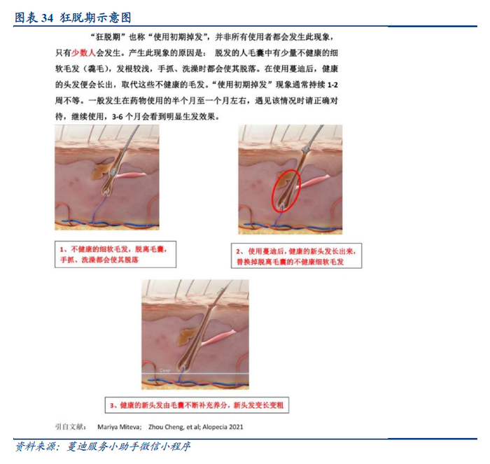 达霏欣为蔓迪的主要竞争对手,为山西振东制药旗下的米诺地尔搽剂,(振东制药为山西省首家登录创业板的上市公司,主营维生素、矿物质制剂、中药、创新药等产品的研发、生产和销售)。达霏欣的品规分为5%和2%两款,其中5%建议男士使用,用于治疗aga和斑秃;2%建议女士及敏感人群适用,用于治疗头发稀疏、产后脱发、发际线宽。有研究表明, 5%米诺地尔比2%米诺地尔浓度起效更早,且安全性并无明显差别(蔓迪宣称5%喷1次/日的效果优于2%喷两次/日)。因蔓迪先发优势明显,较早与医院建立渠道优势,占领医生心智上领先于达霏欣,达霏欣市场分额相对比较低。价格上与蔓迪接近。另常规搽剂需遮光、阴凉保存(温度不超过20℃),而蔓迪PBS通过工艺改进形成保护舱(见图29),仅需密封保存即可,便于携带。
