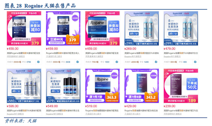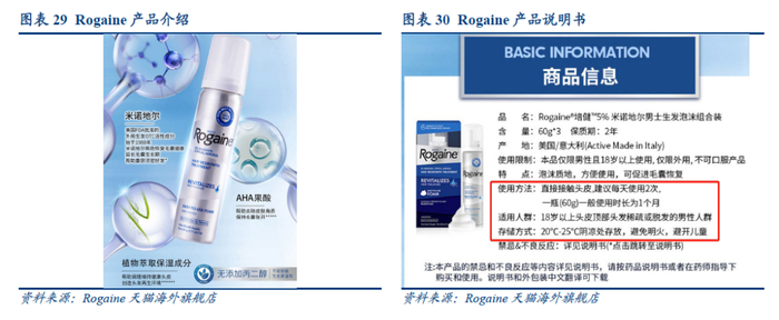 蔓迪对标的落健(Rogaine,美国强生旗下的外用生发水品牌)在美国有约50%左右的高市占率,目前在国内主要以跨境电商方式销售,尚未在内地注册OTC,因此蔓迪在销售渠道上存在壁垒优势。天猫618落健3*60g售价459元,即153元/瓶(60g),与蔓迪米诺地尔酊接近;(男性)也是每日使用两次(1g/次)。