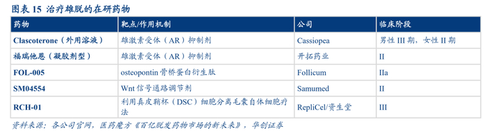 目前治疗脱发唯一认证有效的外用药成分只有米诺地尔,获得FDA、NMPA和国家专利三重认证,经过前期的积累和市场教育之后预计仍将在脱发领域占据一席之地。当前也有其他如克拉考特酮、福瑞他恩等靶向作用于雄激素及其受体信号通路的在研药物。