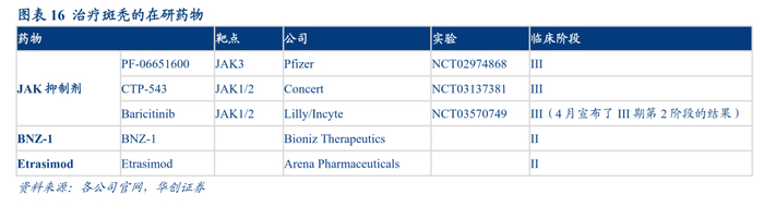 此外,JAK抑制剂领跑斑秃免疫疗法。JAK抑制剂主要通过阻断(IFN-γ和IL-15)信号传导,以中断毛囊被免疫细胞攻击的正反馈路径,从而促进头发的重新生长。目前辉瑞和礼来在JAK抑制剂的进展较快。