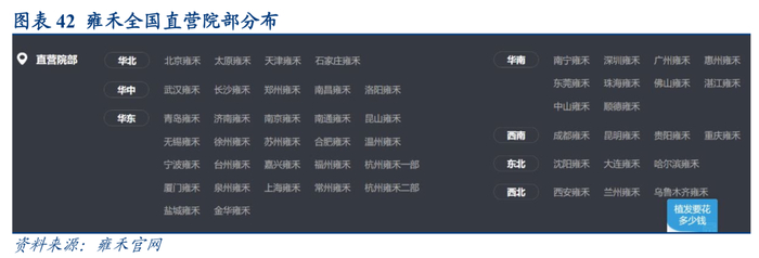 雍禾(全直营):20年雍禾合计直营51家医疗机构,领先于大麦(32家)和碧莲盛(30家);51家医疗机构分别分布在4个一线城市,15个新一线城市,25个二线城市和6个较低线城市,华东地区分布相对广泛。2020年,雍禾植发新增员工1000余名,现有员工3800余人,确保了新分院的人才需求。