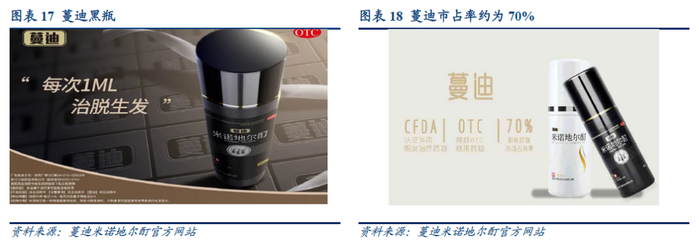 当前我国上市的米诺地尔品牌主要有蔓迪和达霏欣等,其中蔓迪的市占率较高,约为70%;其集团母公司为三生制药(1530.HK)。