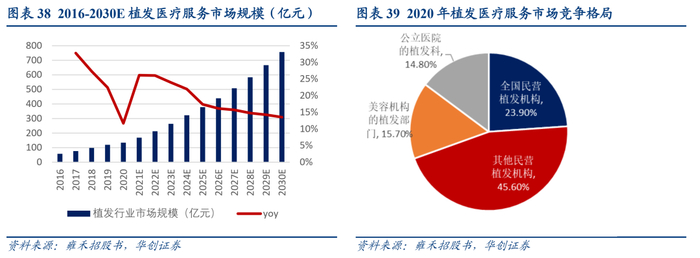 植发医疗。秃顶及毛囊闭合等若干严重的毛发问题仅可通过植发有效解决,2016年我国植发市场规模仅为58亿元,2020年增长至134亿元,年复合增长率为23.4%;按照2020年植发人数,当前渗透率仅0.21%(2020年我国植发手术仅约为51.6万例,而受脱发困扰的人群超过2.5亿人),市场潜力大。