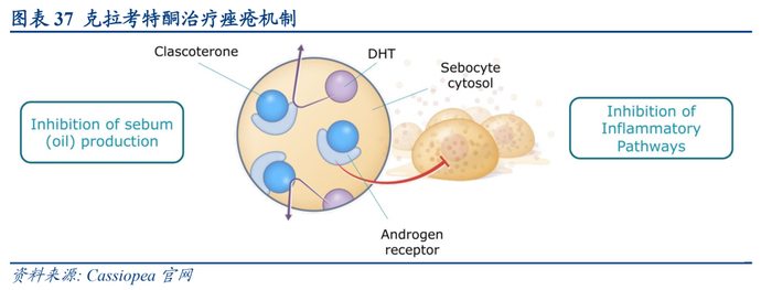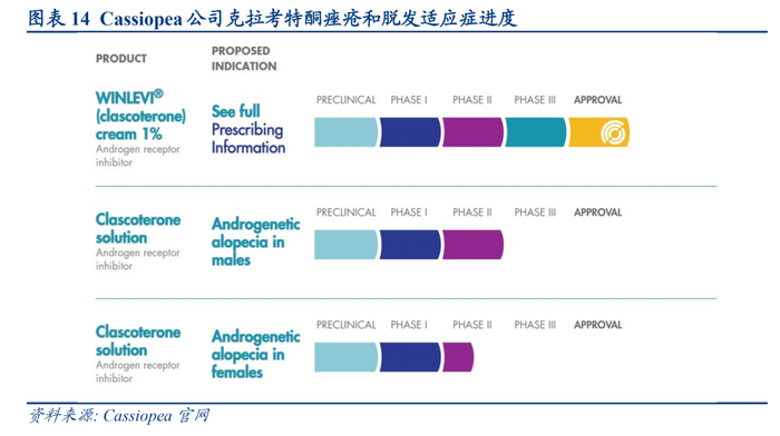 意大利Cassiopea在雄激素受体(AR)抑制剂领域进展领先,旗下的克拉考特酮(clascoterone)为外用的甾体类AR拮抗剂。针对脱发,Cassiopea开发了克拉考特酮的溶液剂型(酊剂);针对痤疮开发了乳膏剂型(已获批上市)。